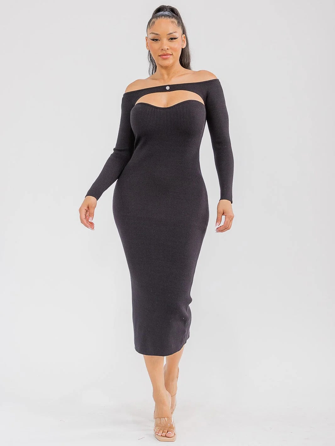 Command attention in this sleek black ribbed midi dress, blending sultry edge with sophisticated stretch. Crafted from a soft, form-fitting knit, the off-the-shoulder neckline reveals a daring front cut-out framed by a subtle metallic ring detail, while long sleeves and vertical ribbing sculpt and elongate your silhouette. The open upper-back design adds a bold, skin-baring contrast to the modest midi length.